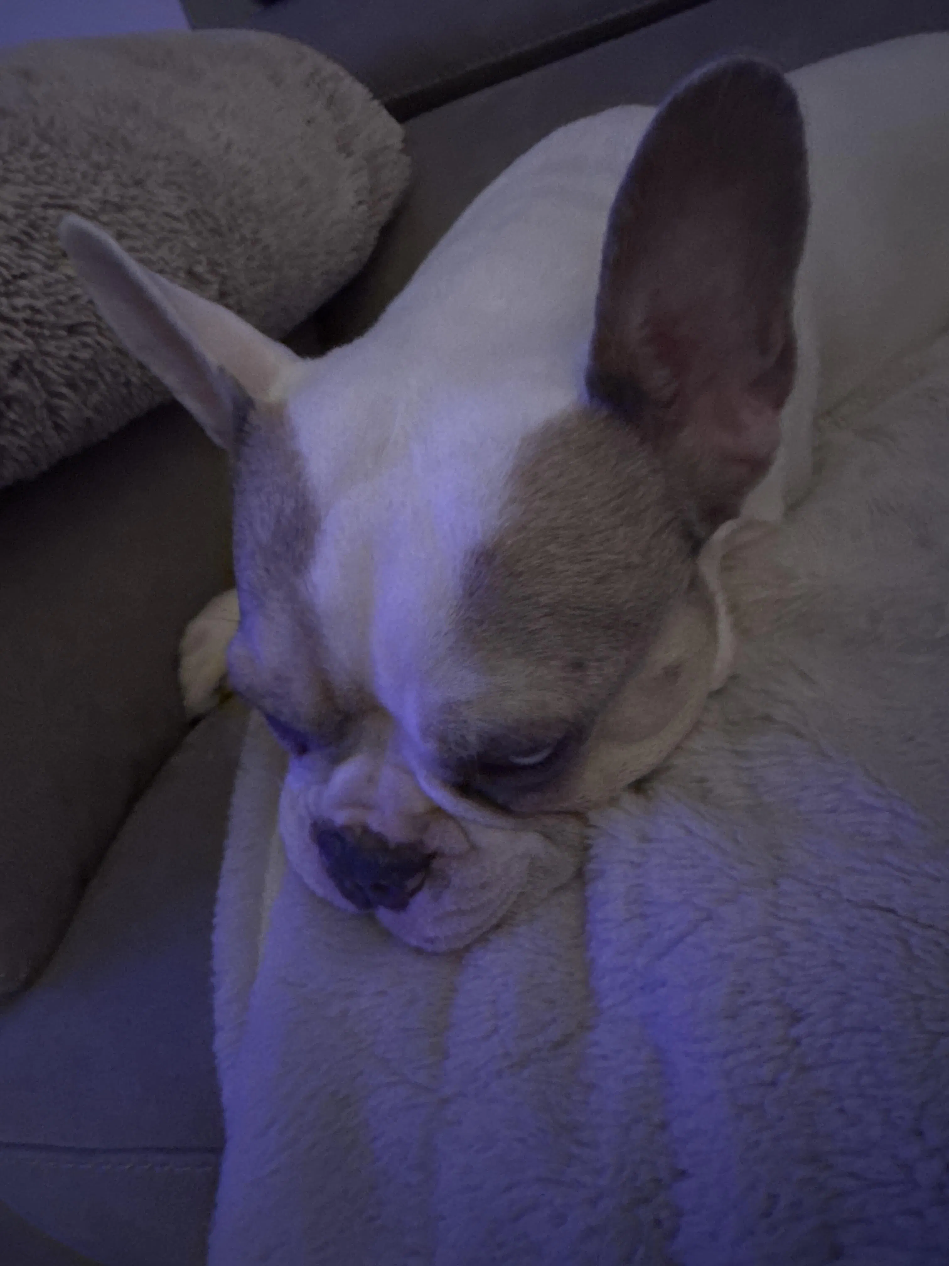 Small light-brown Cockapoo sat on a white bed easting a frozen bone broth Happy Bone directly from their female owner's hand.
