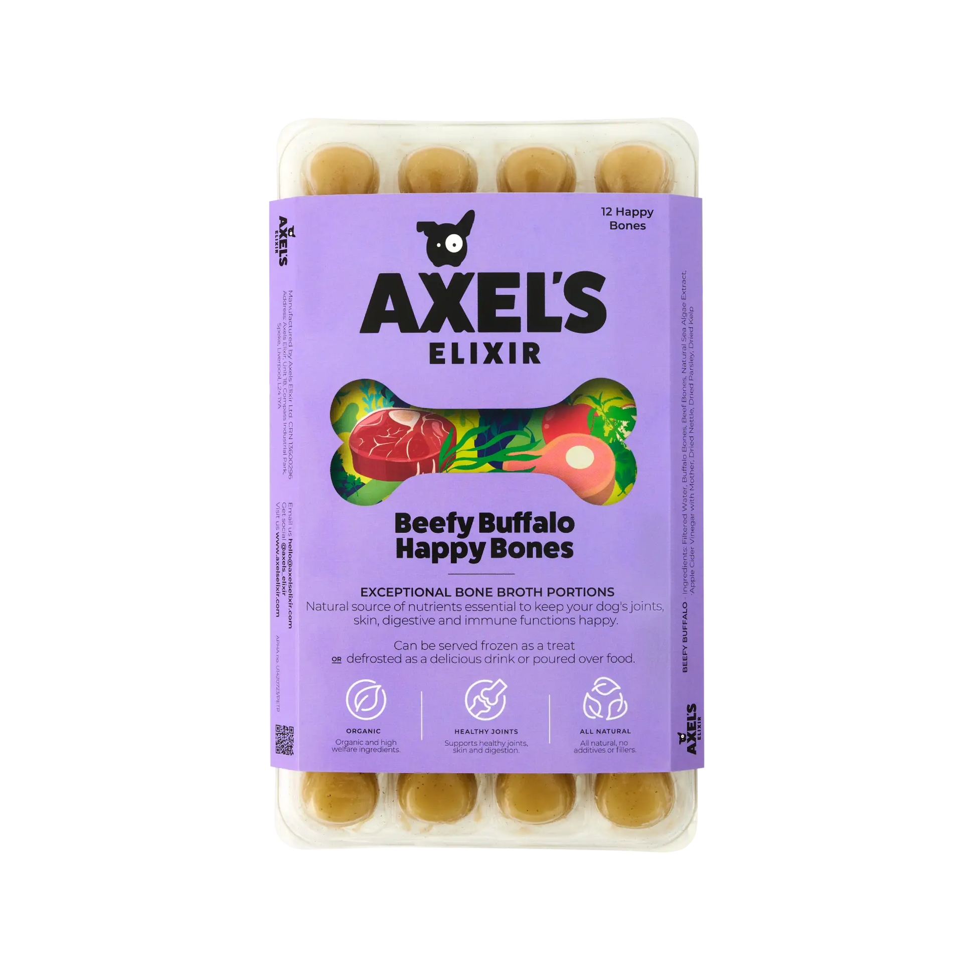 Hand cooked in the UK using only the finest organic, all-natural ingredients, our Buffalo Happy Bones are immediately frozen to lock-in the freshness.