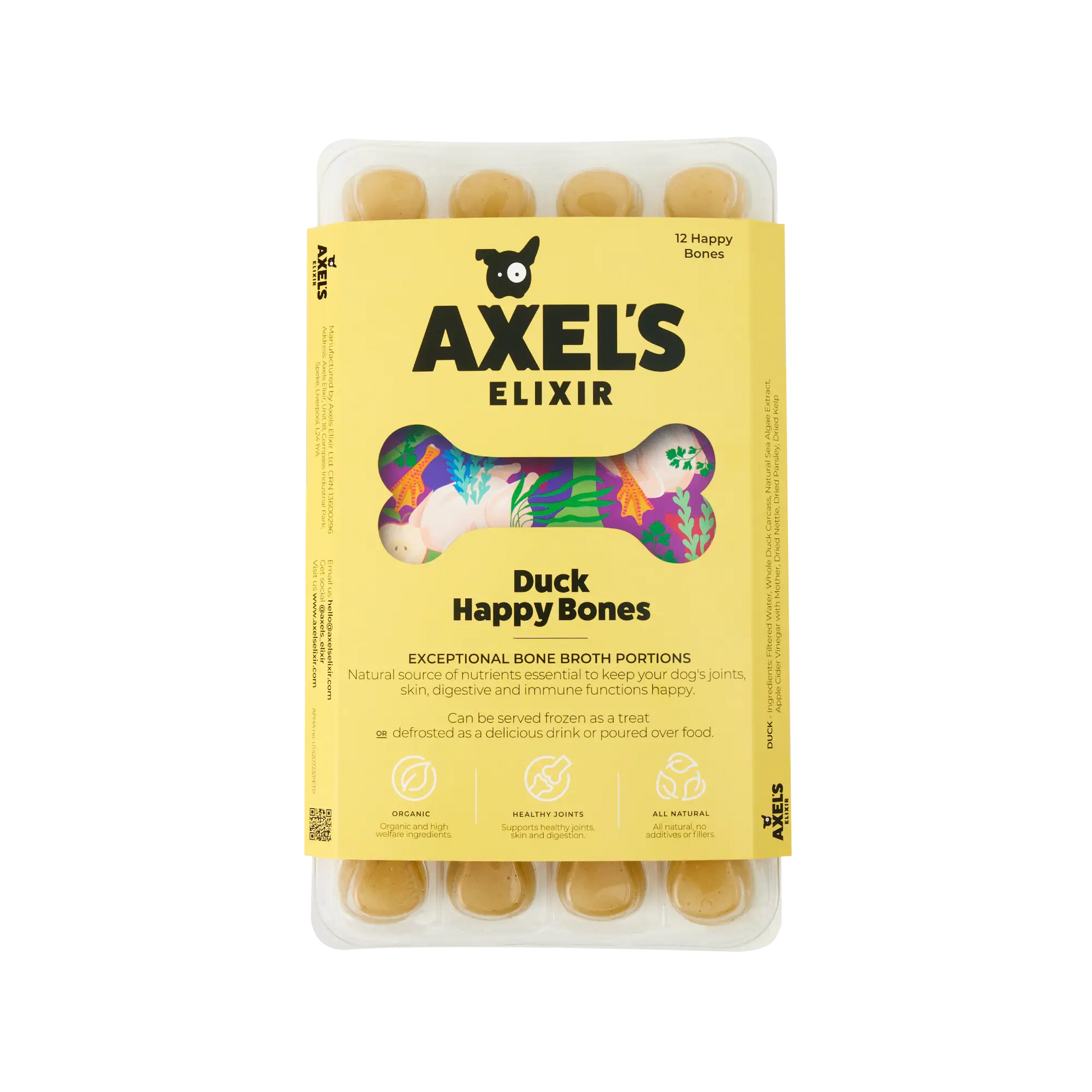 Hand cooked in the UK using only the finest organic, all-natural ingredients, our Duck Happy Bones are immediately frozen to lock-in the freshness.